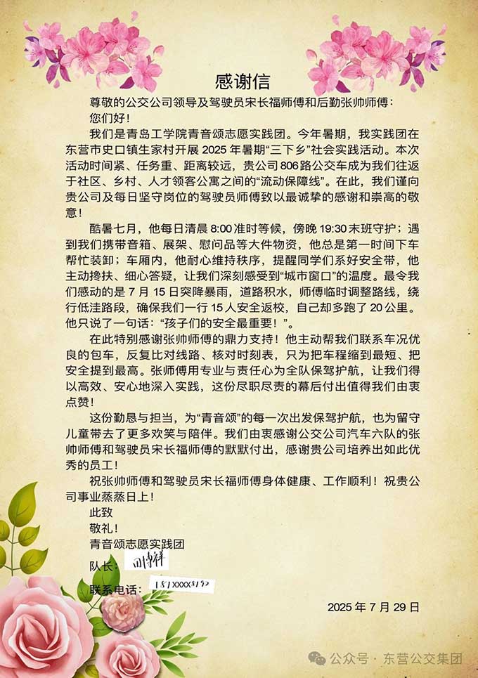 近日,青島工學(xué)院青音頌志愿團(tuán)發(fā)來(lái)一封感謝信,感謝東營(yíng)市公交集團(tuán)駕駛員宋長(zhǎng)福師傅熱情服務(wù)。原來(lái),在今年...